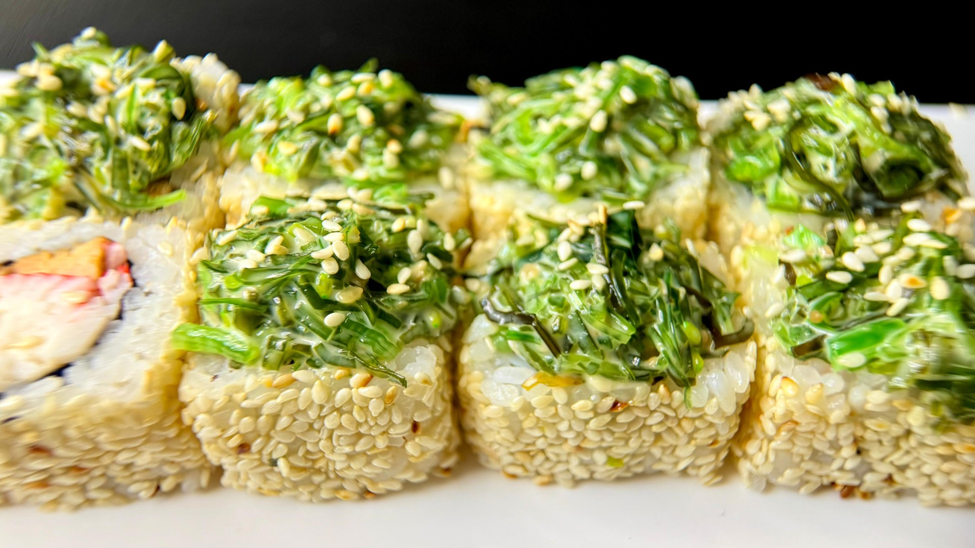 курица жареная, снежный краб, майонез, свежий огурец, сверху: чука в ореховом соусе, кунжут. вес: 260 грамм