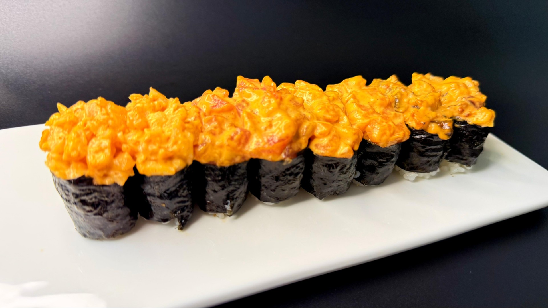 Гункан с лососем охлажденным 2 шт, Гункан с угрем жареным 2 шт, Гункан с креветкой тигровой 2 шт, Гункан с тунцом охлажденным 2 шт, Соус спайси. вес: 240 грамм