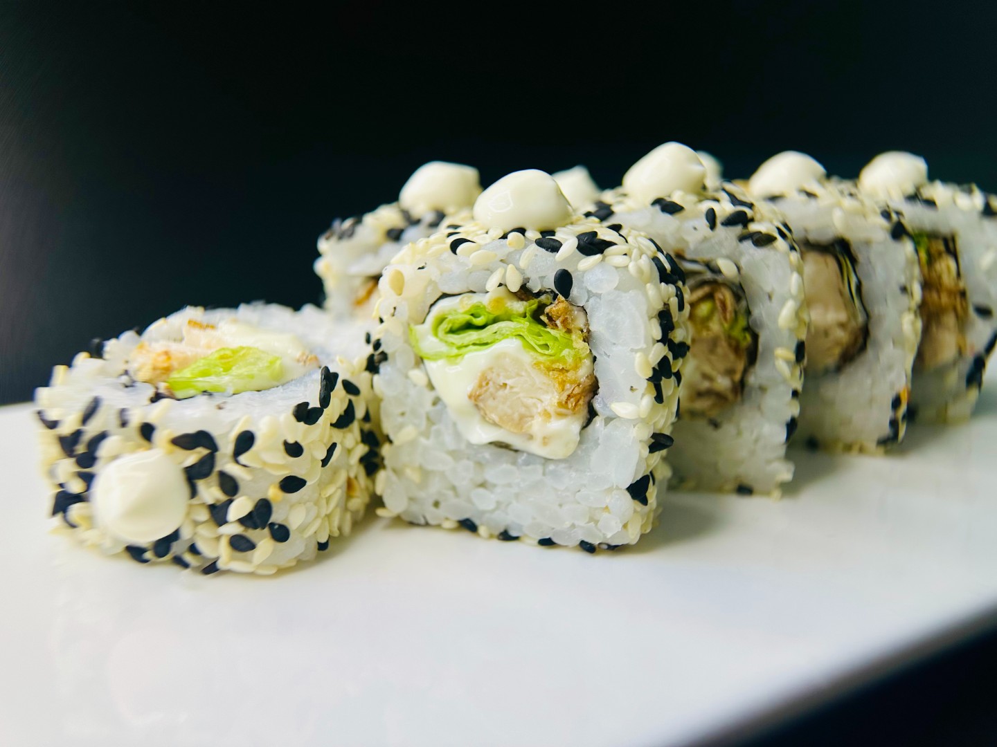 кура жареная, сыр сливочный, лук фри, салат айсберг, кунжут, сверху: капелька майонеза. вес: 200 грамм