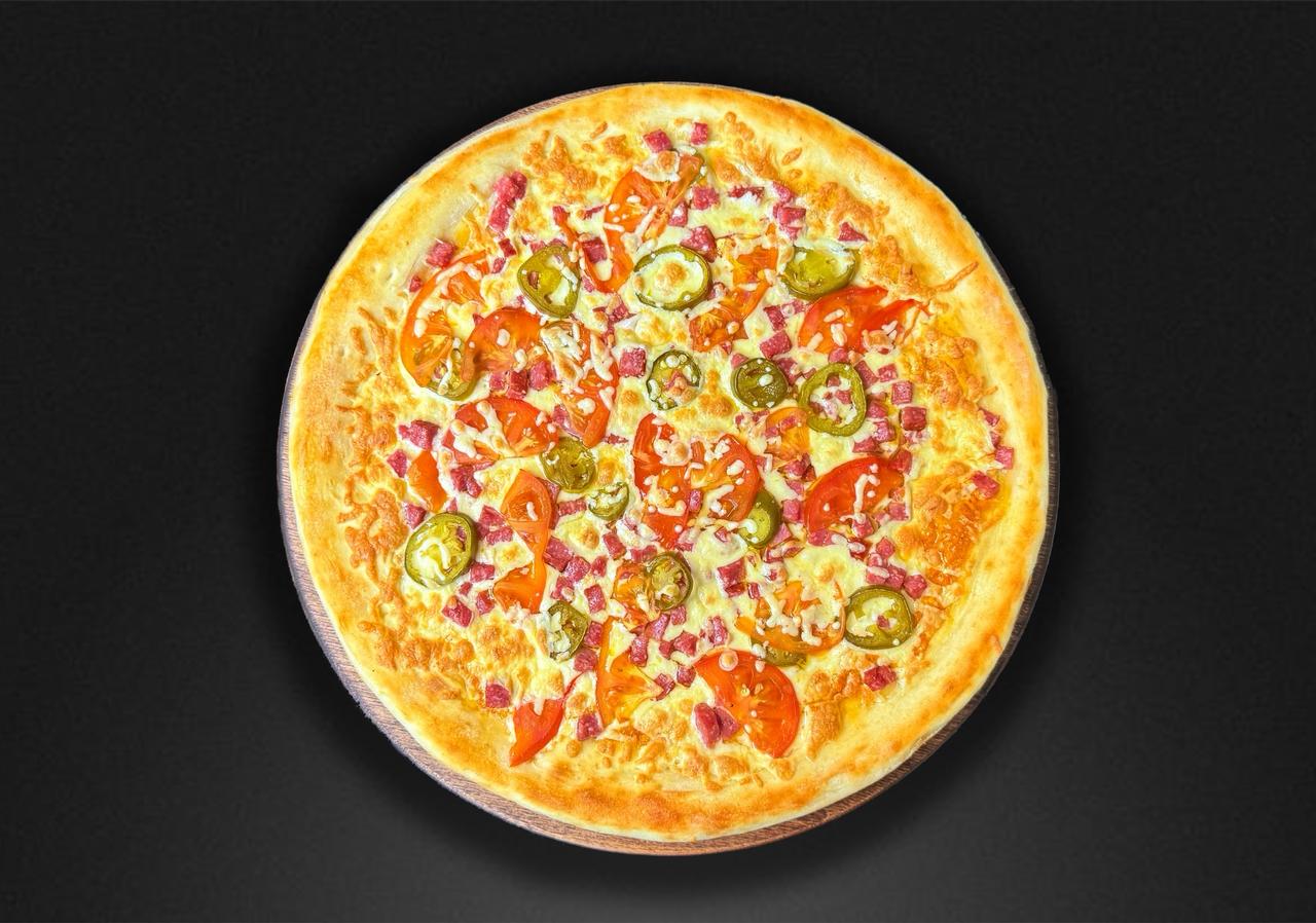 Соус острый, сыр моцарелла, колбаса п/к, помидоры, перец халапеньо.