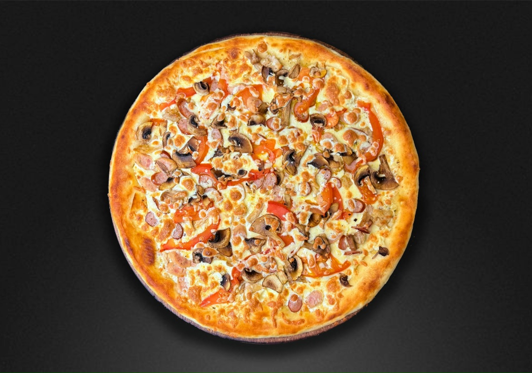 Соус белый, сыр моцарелла, свинина отварная, помидоры, колбаски куриные, колбаски охотничьи, шампиньоны.