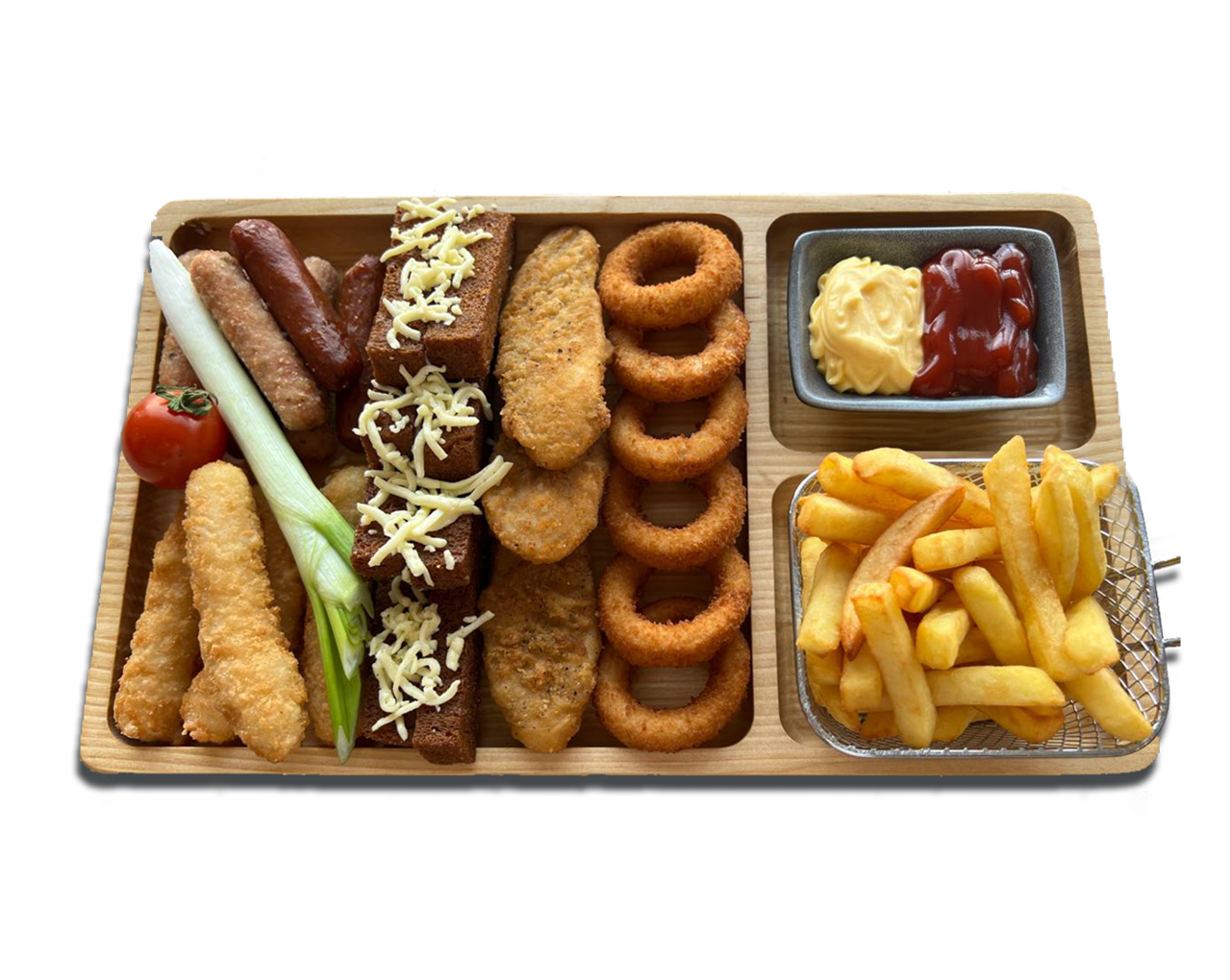 Стрипсы, сырные палочки, луковые кольца, гренки с чесноком и сыром, картофель фри, свиные колбаски, куриные колбаски, соус на выбор + 30 руб.
