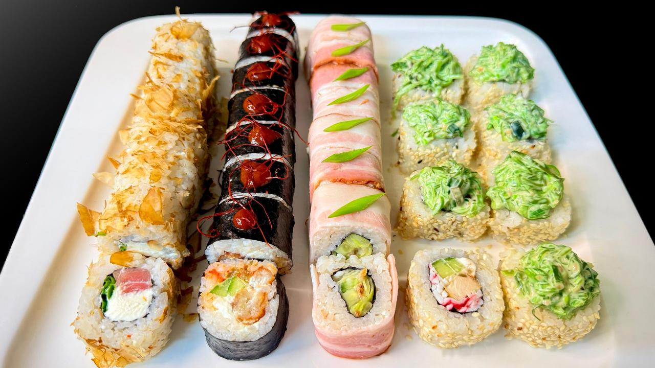 С беконом и луком фри, Окинава, Чука в кунжуте, Ролл тунец. Вес: 870 грамм. 32 шт