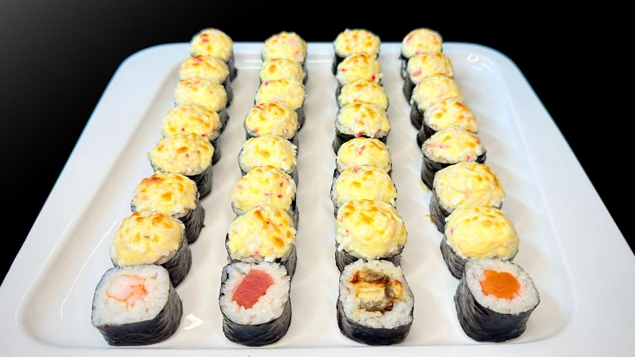 Маки "С лососем", Маки "С креветкой", Маки "С угрем", Маки "С тунцом". Сверху: шапочка снежный краб. Вес: 760 грамм. 32 шт.