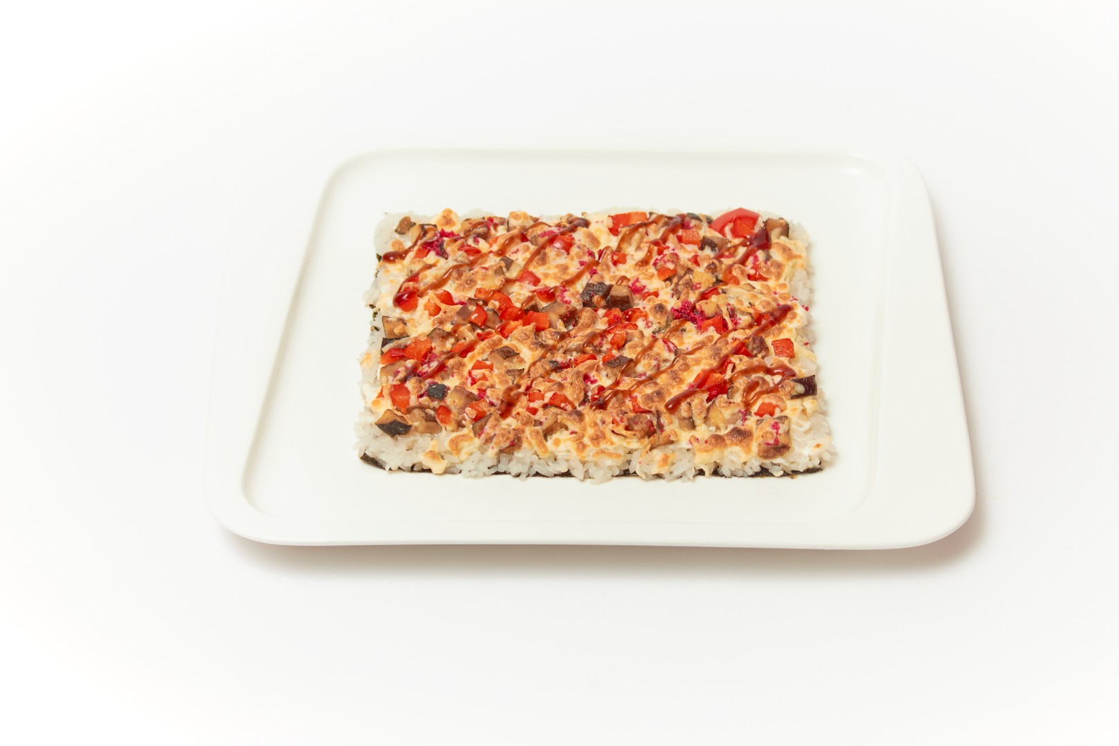 Нори, рис, угорь, перец болгарский, икра масаго, соус унаги, сыр моцарелла, сыр творожный.