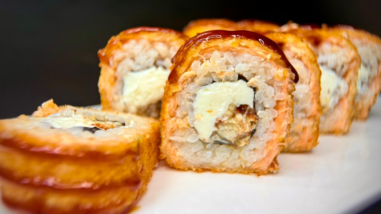 Лосось охлажденный, Угорь жареный, Сыр творожный крем-чиз, Сверху: кляр, сухари панировочные, унаги. Вес: 280 грамм
