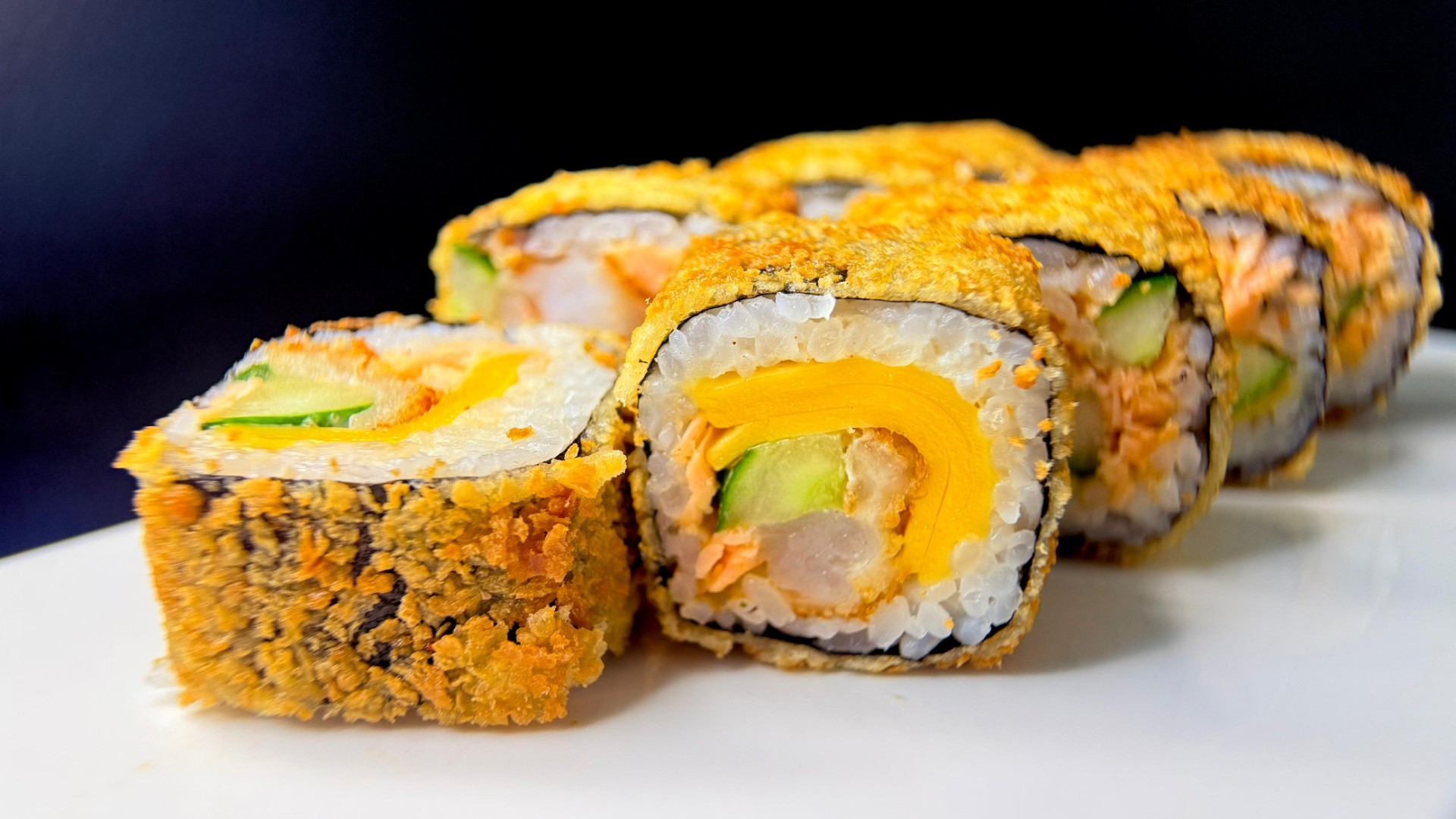 креветка в кляре, жареный лосось, соус спайси, свежий огурец, сыр чеддер. сверху: кляр, панированные сухари. вес: 240 грамм