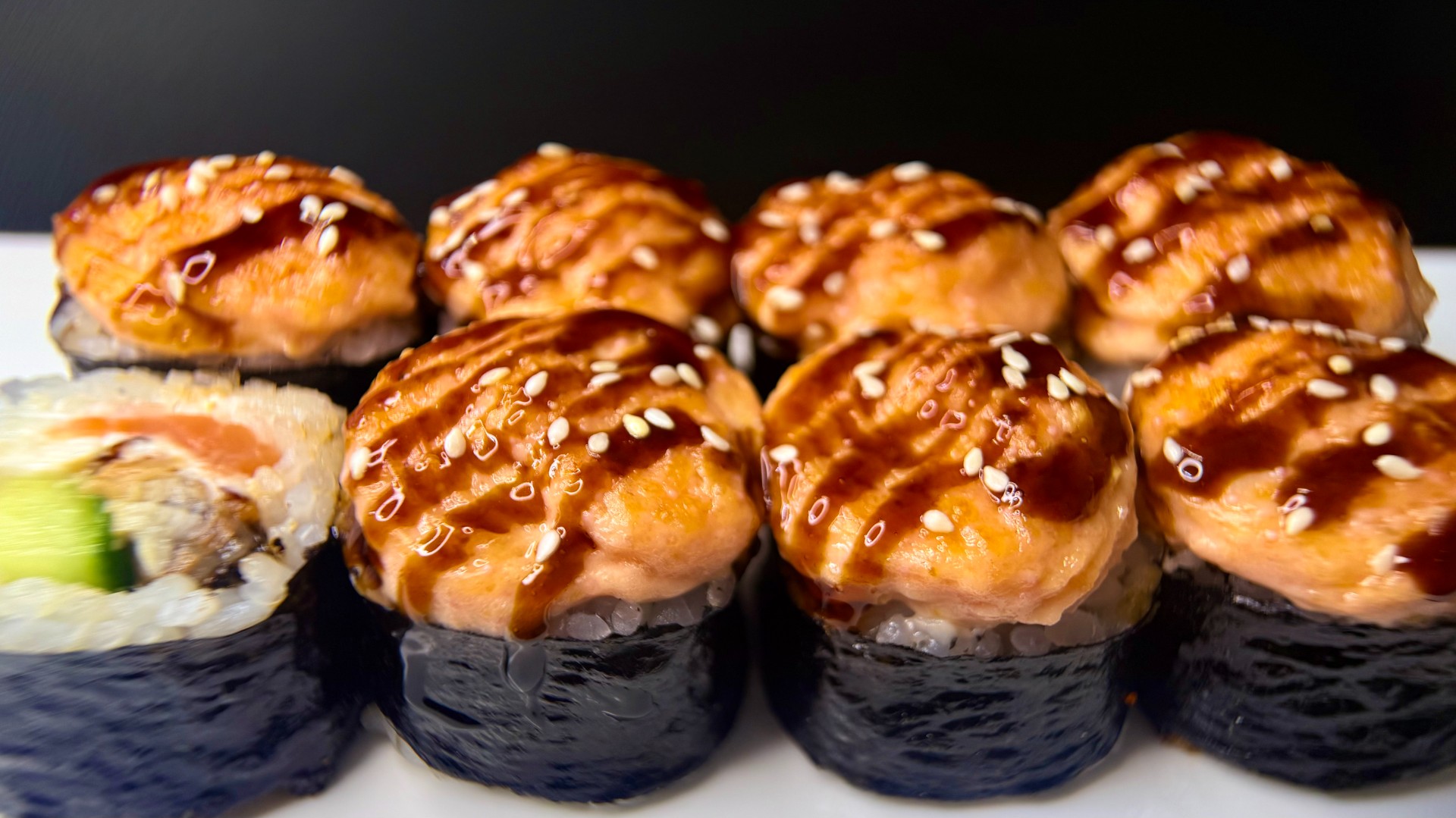 лосось охлажденный, угорь жареный, сыр творожный крем-чиз, огурец свежий. сверху: фирменная шапочка, унаги, кунжут. вес: 264 грамм