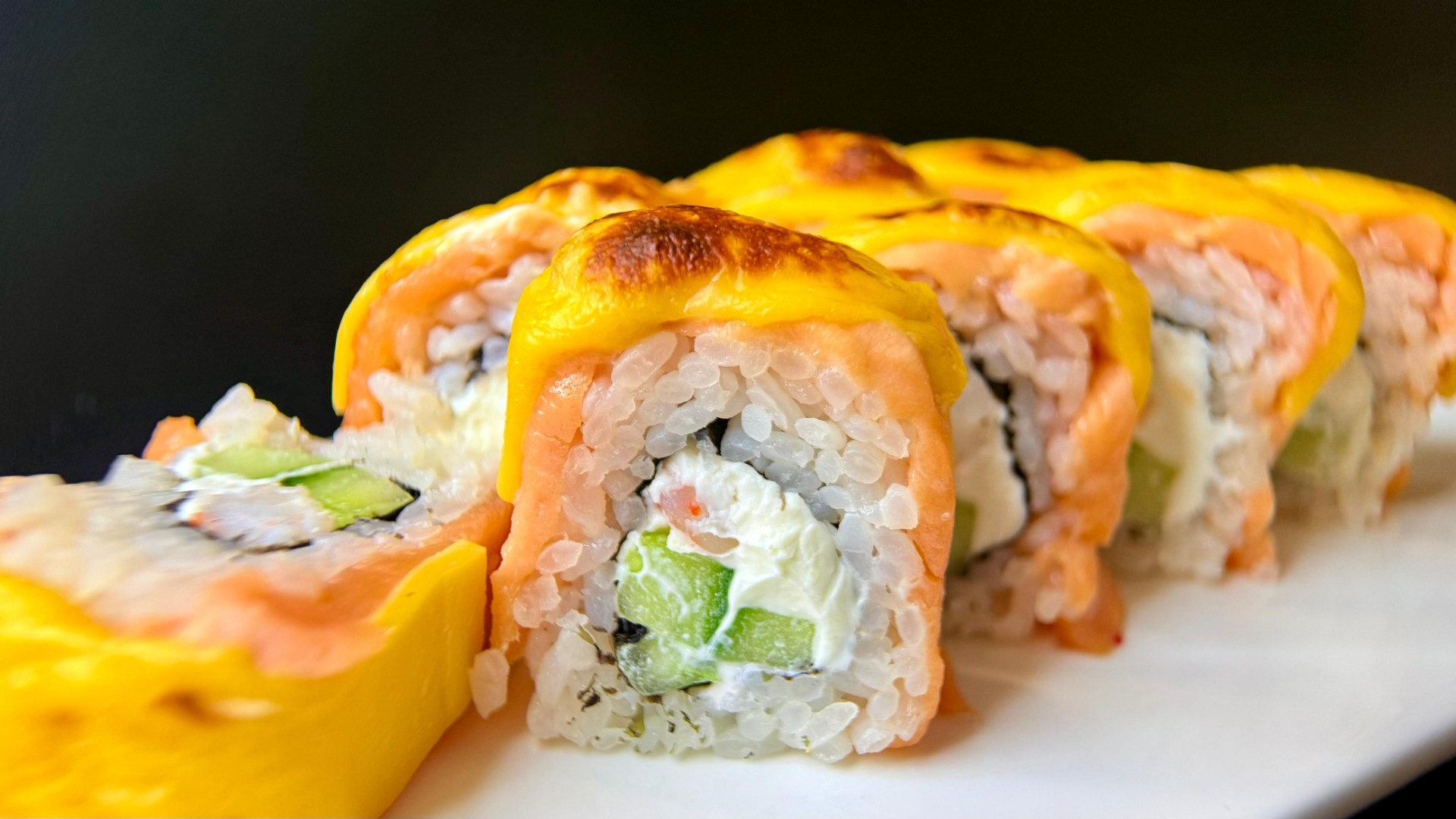 лосось охлажденный, креветка тигровая, сыр творожный крем-чиз, огурец свежий, сыр чеддер. вес: 260 грамм