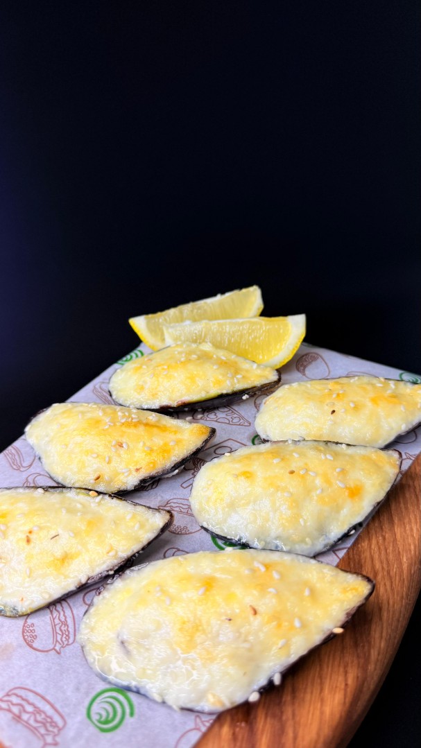 Мидии 6 шт, лимон 2 дольки, фирменный замес с сыром пармезан. Сверху: кунжут.